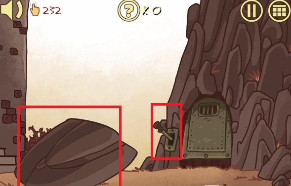 3、这个时候我们来到了一个山顶下,玩家可以先点击这个小人让小人能够战力起来。然后我们在点击山坡上面的那块大石头。然后这个石头就会掉落下来,砸到我们的小人身上。