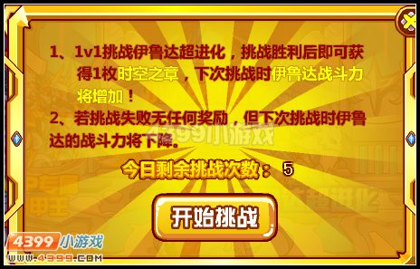 3、【时空之章】的获得方法是,1V1挑战伊鲁达超进化,获胜就可以获得1个。如果失败,那么伊鲁达克的血量会降低。每天有5次免费机会。