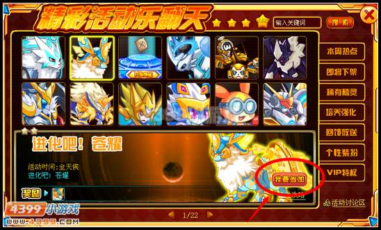 1、首先赛尔们可以在活动面板中找到苍耀进化活动,点击我要参加去看看吧。