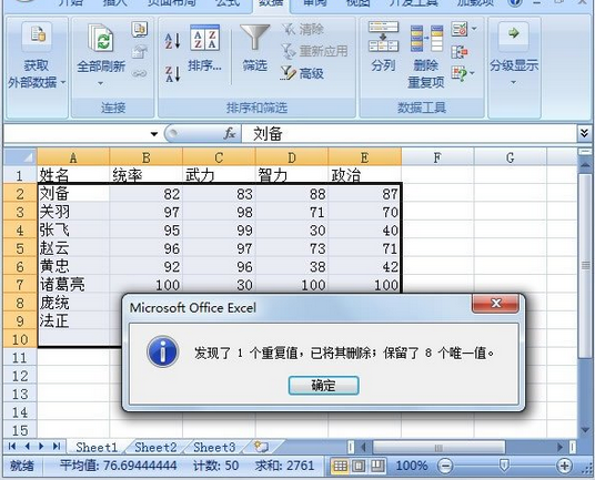 4、单击确定按钮之后,就会删除重复项了。