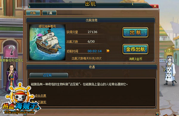通过主船的船长室,玩家可以进行出航操作,每次出航都可获得贝里奖励,船长室和水手室的等级越高,每次出航所获得的贝里就会越多。而且,每次出航都有机会遇到奇遇,选择不同答案,也会有机会获得贝里、声望、阅历等不同的随机奖励。