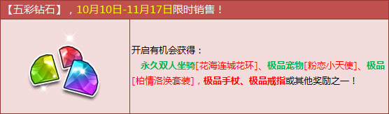 qq飞车花海连城花环怎么得?据悉,从即日起到11月17日,只要在商城购买“五彩钻石”,开启就有机会获得永久双人坐骑【花海连城花环】、极品宠物【粉恋小天使】、极品【柏情洛涣套装】以及极品翅膀、极品手杖或其他奖励之一哦!以下是活动详情介绍,下面就一起来看看吧!
