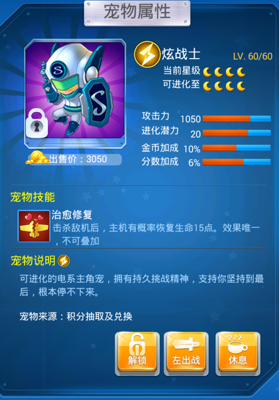 内置3秒,3秒一过,只要击杀敌机,必定回血,效果很强悍,是比较好的生存型宠物,回血量和当前星数有关,1星月亮回6点,2星8点,3星10点,4星12点。