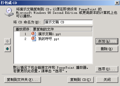 首先启动PowerPoint 2003,打开需要打包刻录的PPT文件。依次单击菜单命令“文件→打包成CD”,弹出如图1所示的“打包成CD”对话框。如果您有多个演示文稿,可以单击“添加文件”按钮进行添加。