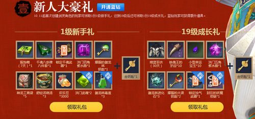 10.11起首次创建剑灵角色的玩家可领取1份1级新手礼,达到19级后还可领取1份19级成长礼,蓝钻玩家可获得额外道具。