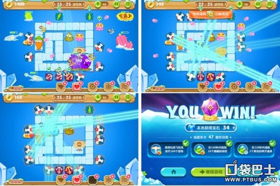 在游戏过程中,先在怪物出口处右侧安装玩具飞机塔,选择清除中间的红雪糕道具,并兼顾消灭来袭怪物。清除中间红色大雪糕后可获得4个便便塔,建议换装章鱼塔,并在清除其它道具后多安装一些章鱼塔,有利于尽早完成第二个额外任务。