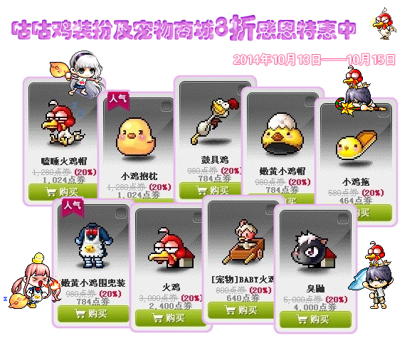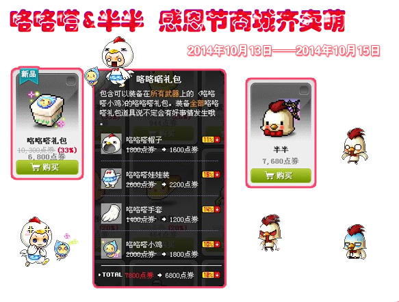 冒险岛感恩节商城活动开启了,咕咕哒礼包在10月13日上线了,萌萌的咯咯嗒装备很是可爱,还有咕咕鸡装扮级宠物商城8折感恩特惠,下面小编就给大家详细介绍活动详情吧。