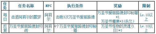 活动内容:活动期间,10级以上玩家可在NPC阿莉尔处接取活动任务,完成任务条件,获得一定奖励。