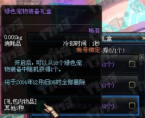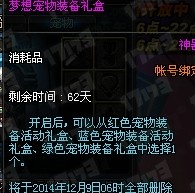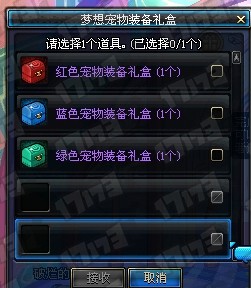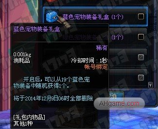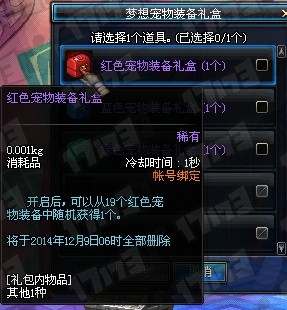 开启后,可以从红色宠物装备获得礼盒、蓝色宠物装备获得礼盒、绿色宠物装备礼盒中选择1个。