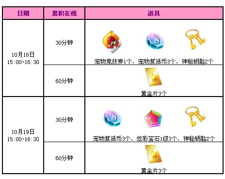 活动期间累积在线,即可获得宠物用品、1级宝石、黄金卡片等诸多好礼。