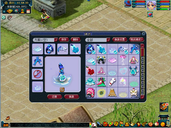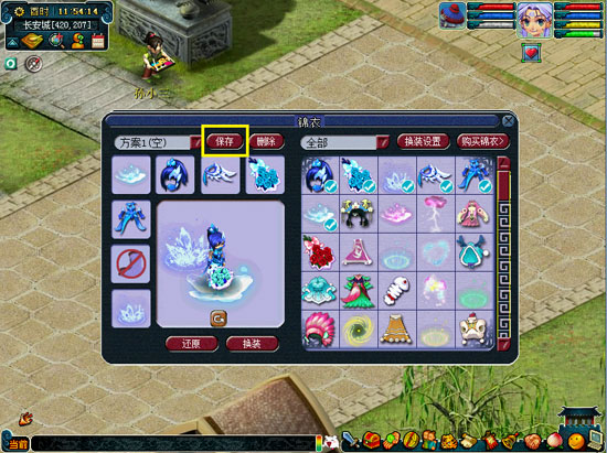 打开锦衣栏,点击左上角“换装方案”的下拉列表,打开自动换装的衣柜列表:
