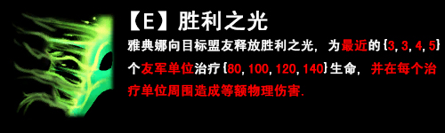 【E】胜利之光:奶量不算很足,但是在前期对线大家血量都不是很厚的情况下,队友血量较低时补给一口足矣。要注意一点就是不要仗着有治疗技能就不停进攻,雅典娜并非强攻型的英雄而且这个技能的耗蓝还是很高的。