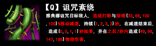【Q】诅咒紊绕:小控技,进可攻退可守。但是在没点到3级带眩晕时,用作进攻、抓人感觉比较乏力效果不太理想。这个技能在第3级和第4级的变化就只有造成的伤害提高了,所以无必要直接点满。点出眩晕效果就可以考虑去点属性。