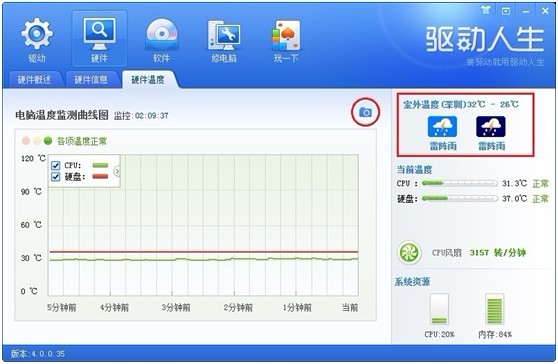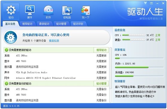 一键处理完成之后软件会弹窗提示“一键处理完毕”,这时我们点击重新检测之后,软件将会显示驱动正常,并在下方将电脑的配置简单显示出来。除此之外,在软件主界面侧边栏还添加了温度信息与资源情况,用户只要打开驱动人生2012,就可以对电脑的情况一目了然了。(如图二)