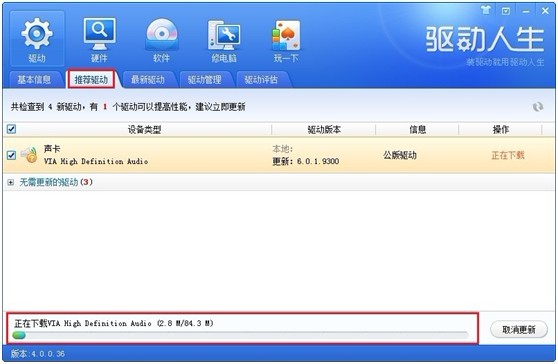 若设备没有安装驱动或者驱动版本较低,驱动人生2012在推荐驱动中会通过检测推荐驱动版本提示安装,可以勾选设备类型选择是否安装推荐驱动,选择好之后点击一键更新便开始下载驱动,同时显示下载进度。(如图三)