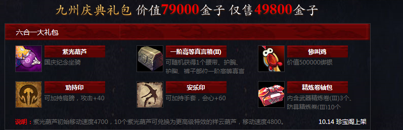 说明:紫光葫芦初始移动速度4700,10个紫光葫芦可兑换为更高级特效的祥云葫芦,移动速度4800。