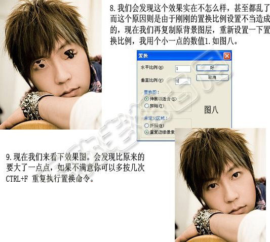 8、我们会发现这个效果实在不怎么样,甚至都乱了。原因是由于的置换比例设置不当造成的,现在我们再复制原背景图层,重新设置一下置换比例,我用小一点的数值1,如图所示: