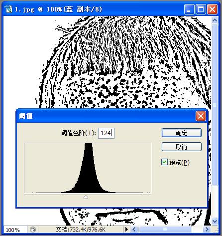 步骤二、接下来开始对色斑与皮肤分离,这里用到阀值调整,【图】→【调整】→【阀值】,参数适当调整为只选择色斑,这里设为124,如图: