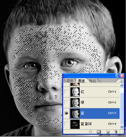 步骤四、然后进行Ctrl+I反色,然后进行高斯模糊,参数设置为0.5对色斑边缘进行柔和处理,再按Ctrl点蓝色通道副本把选区选中,再点蓝色通道,如图所示: