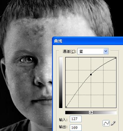 步骤五、接着按Ctrl+H隐藏选区,再按Ctrl+M曲线调整,对选中的色斑进行色阶值调整,参数设置为输入127,输出169,如图所示: