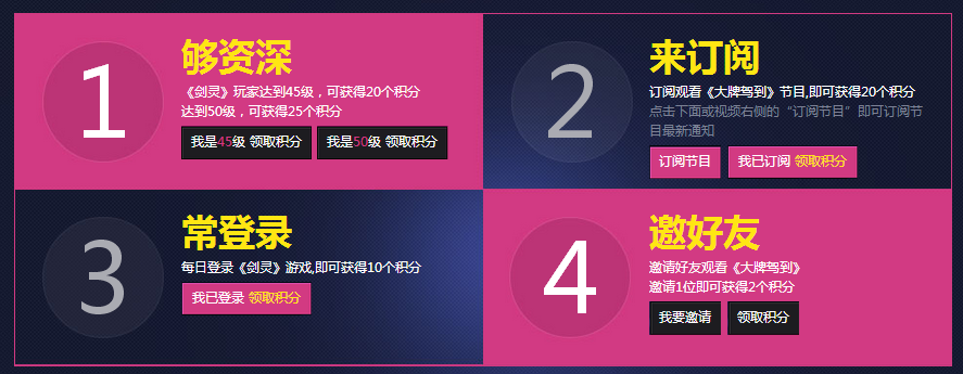 1) 在《剑灵》游戏中达到45级,可获得20个积分,达到50级,可获得25个积分,每个游戏内角色限领一次;