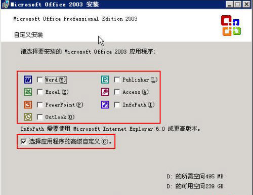 Microsoft Office Document Image这个程序的安装一般都是附带Microsoft Office下载下来的,所以我们只需要在安装Microsoft Office的过程中进行处理即可,我们以2003为例子,在安装过程中选择自定义,如图所示: