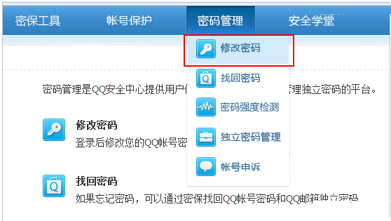 注: 若帐号未有任何密码保护方式,需要先设置密保手机后方可进行密码修改。已有密保的帐号可选择【密码管理】-【修改密码】进行密码修改。