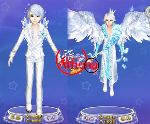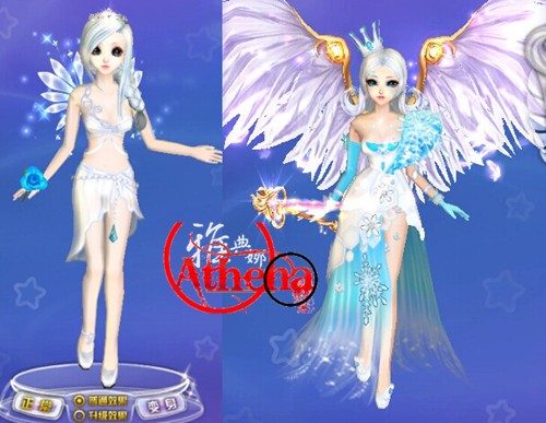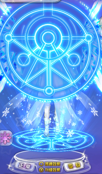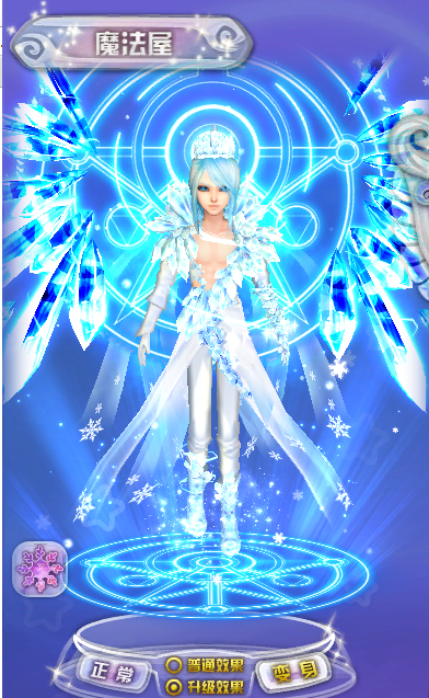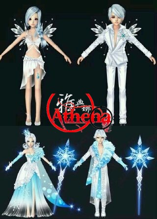 圣雪冰皇却是以冰蓝色为主。男女在普通状态下背后都有一个小翅膀,颇似动画里的小精灵的样子。而变身后女衣更像冰 雪奇缘女王样子。或许是以冰 雪为主,所以整体用类似冰块的蓝色。