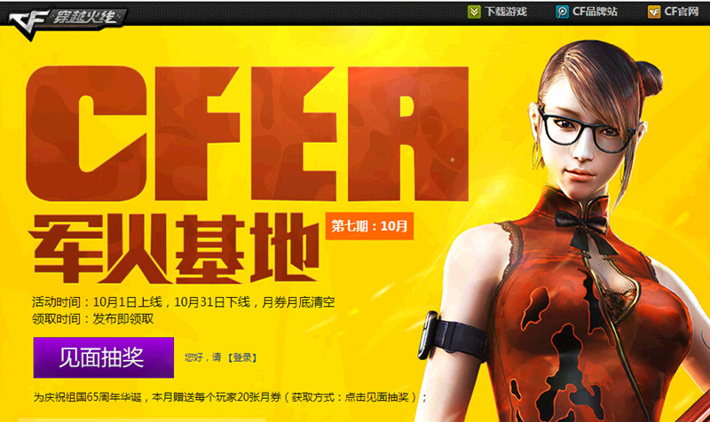 金秋十月,由《穿越火线》官方举办的日常性回馈活动“CFer军火基地”第七期如约登场。本期“军火基地”延续了历次活动月券获取方式丰富、道具奖励丰厚的特点,将为玩家在10月火线战场提供充分补给。此外,因恰逢祖国65周年华诞,10月CFer军火基地还额外赠送每位玩家20月券,让CFer欢度整个“国庆月”!
