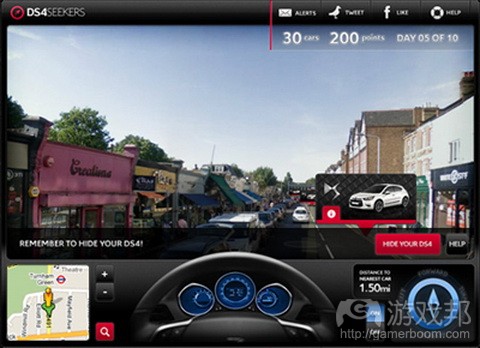 4. 汽车制造商通过谷歌街景制作大型捉迷藏游戏:雪铁龙+定位应用+游戏。这是法国汽车制造商雪铁龙推出的创造性组合。游戏叫做《DS4Seekers》,玩家有机会赢得雪铁龙DS4汽车。这背后的整体理念是什么?如Mashable所述:“玩家通过隐藏和收集虚拟DS4s获得积分。若你成功实现目标,便能获得积分。一个积分相当于一次抽奖机会。玩家获得的积分越多,最终获胜的机率就越大。若玩家玩的是手机版本(此内容目前尚未投放美国市场),积分就会翻倍。该公司早期所推项目的内容是让用户通过谷歌地图和谷歌街景寻找隐性汽车。若玩家处于隐藏DS4的1公里范围内,定位罗盘就会告诉你朝何处迈进。只要玩家靠近隐藏DS4,屏幕指针就会出现,告知玩家准确位置。”Mashable表示,Mini去年也在斯德哥尔摩发起类似活动。从中我们可以发现定位游戏无疑是种新兴类型。