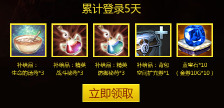 对应天数的累积登陆奖励,每个账号每个大区仅可领取一次。