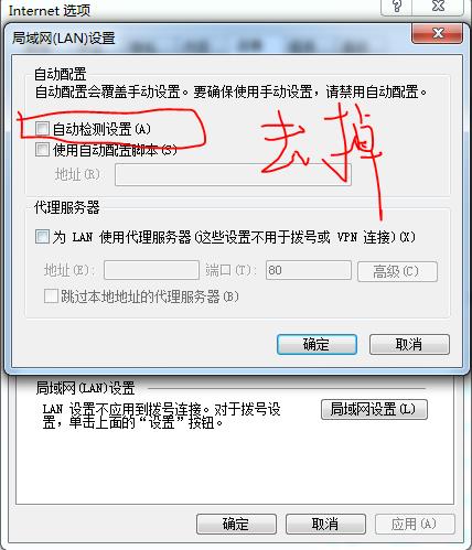 接着进入IE 工具-internet选项-连接-局域网设置 去掉自动检测的勾