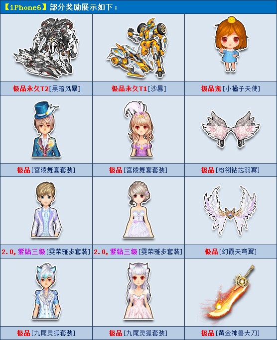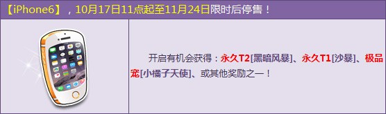 活动介绍:在商城购买“iphone6”,开启就有机会获得永久T2黑暗风暴、永久T1沙暴、极品宠小橘子天使或其他奖励之一。