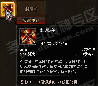 【封魔杵】圣僧将手中金刚杵变大抛出,金刚杵在目标区域高速旋转,每次对范围内的敌人造成伤害,持续5秒。