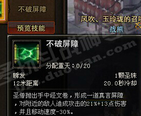 【不破屏障】圣僧抛出手中经文卷,形成一道真言屏障,对附近的敌人造成伤害,并且移动速度降低30%。