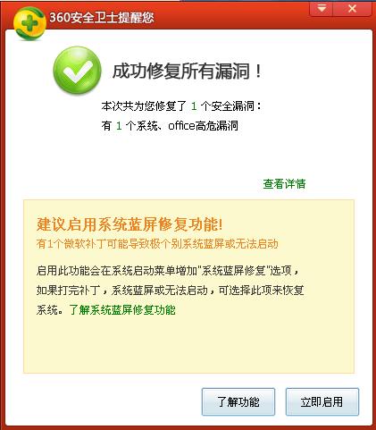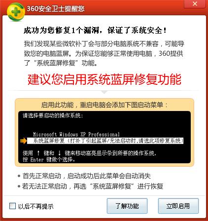 1. 当360漏洞修复程序发现用户选择了有可能会打蓝屏或造成系统无法启动的微软补丁时,会自动先帮您备份相关的系统关键文件。在打补丁结束后如果发现用户没有启用系统蓝屏修复功能,则会提示用户启用系统蓝屏修复功能。