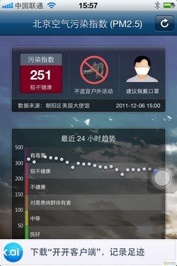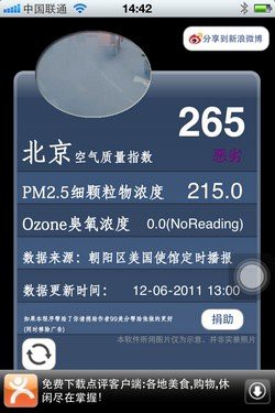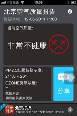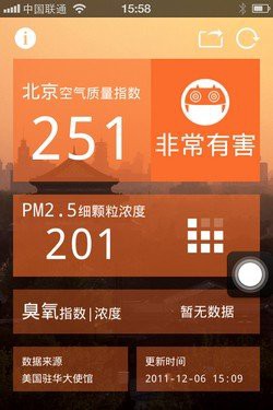 “北京空气污染指数”是一款实时播报北京空气污染指数 (PM2.5) 的应用,使用的数据来自于北京市朝阳区美国大使馆定时播报的空气质量数据。