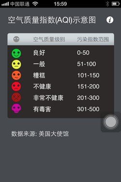 本应用数据来源是位于朝阳区北三环东北角的美国使馆定时播报的北京空气质量。