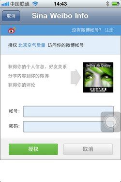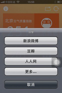 同时本软件支持新浪微博,可将空气质量信息发送到你的新浪微博账号。另外还可以通过短信转发空气质量信息。