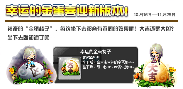冒险岛幸运的金蛋椅子喜迎新版本,幸运的金蛋椅子加入了转蛋机,冒险岛幸运的金蛋椅子怎么样呢?神奇的“金蛋椅子”,每次坐下去都会有不同的效果哦!大凶还是大吉?坐下去就知道了,下面小编变就给大家详细介绍冒险岛幸运的金蛋椅子吧。