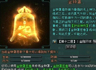 金钟罩共十二层,除了需要服用【护体神丹】打通百骸以外,还需要再研习【金钟罩密卷】练体强身,如此反复,终能达成。【金钟罩密卷】可以击杀70~90级的地图怪物获得(包括终南山,古墓,终南后山)。【护体神丹】商城有售,并在圣兽封印阵副本的通关奖励中增加3颗。