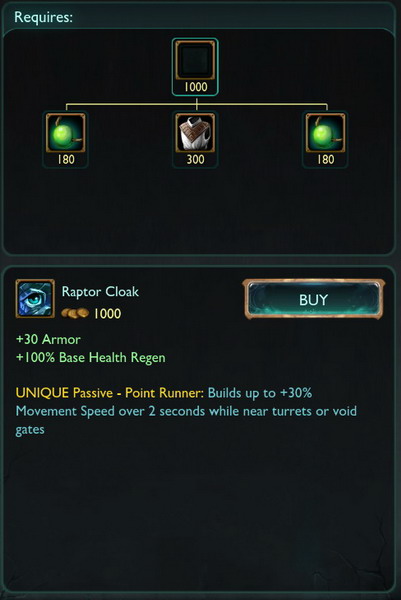 猛禽斗篷:+30护甲,+100%基础生命值回复;附近有防御塔时,在2秒内,移动速度提高至30%。