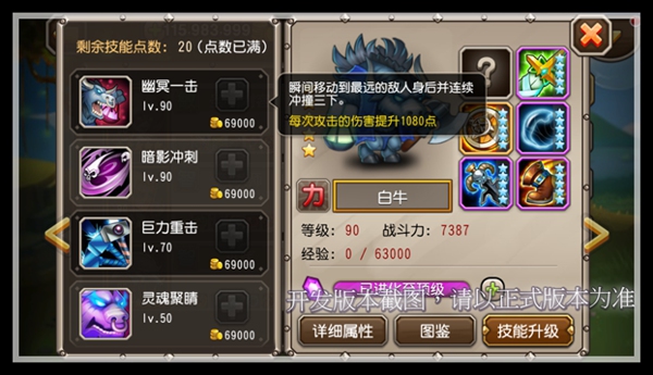 二技能暗影冲刺,开场后,从视野外冲向战场中央,冲撞所有途中碰到的敌人并造成伤害。从视频中可以看出,此技能大概是开场3秒后白牛从场外冲进,撞晕前排敌人,压缩阵型。