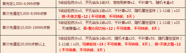 2)活动期间每个角色只能参与一次首充活动,如果充值了1000点券获得奖励后,再次充值将不会获得任何奖励。