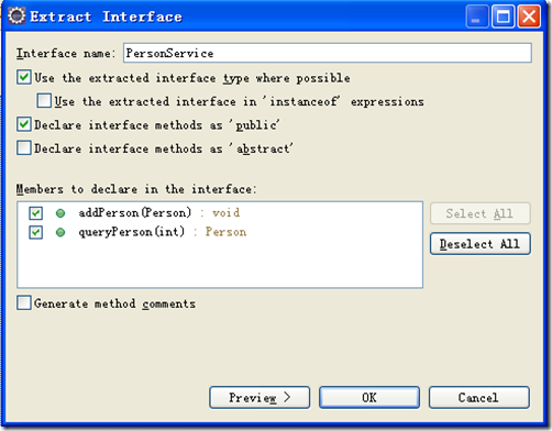 在“在Extract Interface”对话框中,Interface name框中输入接口名:PersonService,将addPerson和queryPerson方法钩选上,如下图: