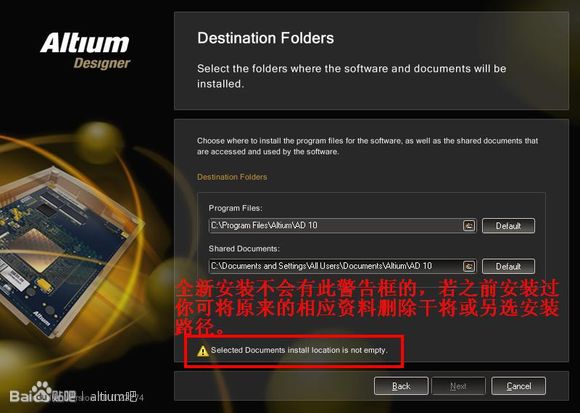前面也太顺利了吧,这里给你出个难题看一下,欺负我不认识英文?小意思,网上一查,然来是说安装目录不是空的,哦原来我之前缷软件后这些文件夹有残留的文件,我按照这个路径提示,果真找到了相应的文件夹,我将它们全部干掉,再就没有这个警告框了,其实大家不用急,第一次装不会有这个警示的,我其实也可不理会它,另外装到别的地方就可以了。
