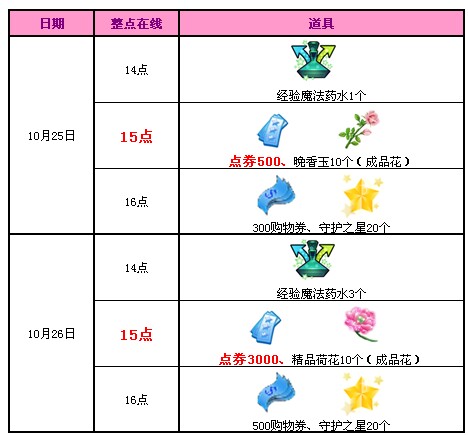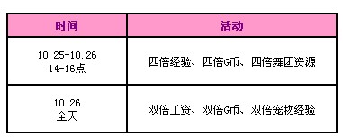 10.25-10.26每天14-16点期间将为大家开启四倍经验、四倍G币、四倍舞团资源活动。10月26日全天将开启双倍工资、双倍G币、双倍宠物经验活动。
