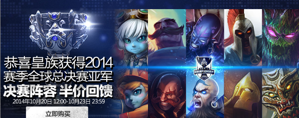 lol2014全球总决赛在2014年10月19日圆满结束了,经过激烈的战斗,最终皇族1:3惜败给SSW,获得亚军,lol特开启皇族在决赛中皮肤英雄半价活动,下面小编就给大家详细介绍lol2014皇族英雄皮肤半价活动内容以及活动地址吧。