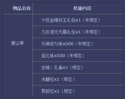 2、活动期间内凡等级在未飞升91级-134级(含134级)的在线角色将获得道具“宴山亭”1个。