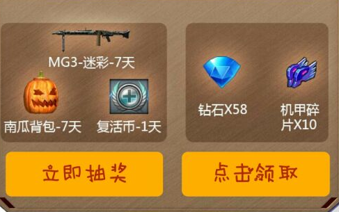 1、用户下载天天来战,即可领取58钻石和机甲碎片X10,并且可以抽取cf道具:MG3-迷彩-7天、南瓜背包-7天、复活币1天中的其中一个道具。